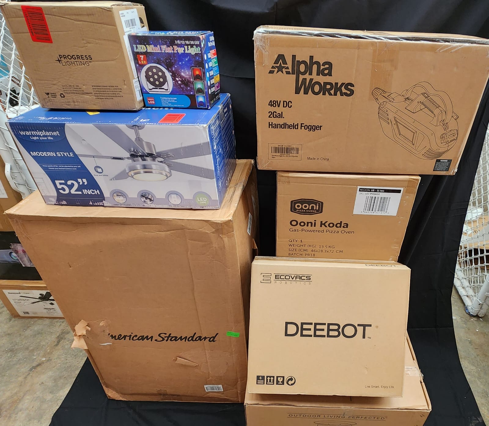 LOTE COMPUESTO POR: (1) MAQUINA PARA DESINFECTAR ALPHAWORKS FOGGER MACHINE ULV, (1) HORNO PARA PIZZA A GAS PORTATIL, (1) ROBOT ASPIRADORA TRAPEADOR S7 PRO, (1) TARJA DOBLE DE ACERO AMERICAN STANDARD, (1) CHIMENEA DE GAS PROPANO OUTLAND LIVING FIREBOWL 883 MEGA, (1) VENTILADOR DE TECHO CON CONTROL REMOTO WARMIPLANE, (1) LAMPARA DE BA? PROGRESS LIGHTING P300045-020, MERCANCIA NUEVA.