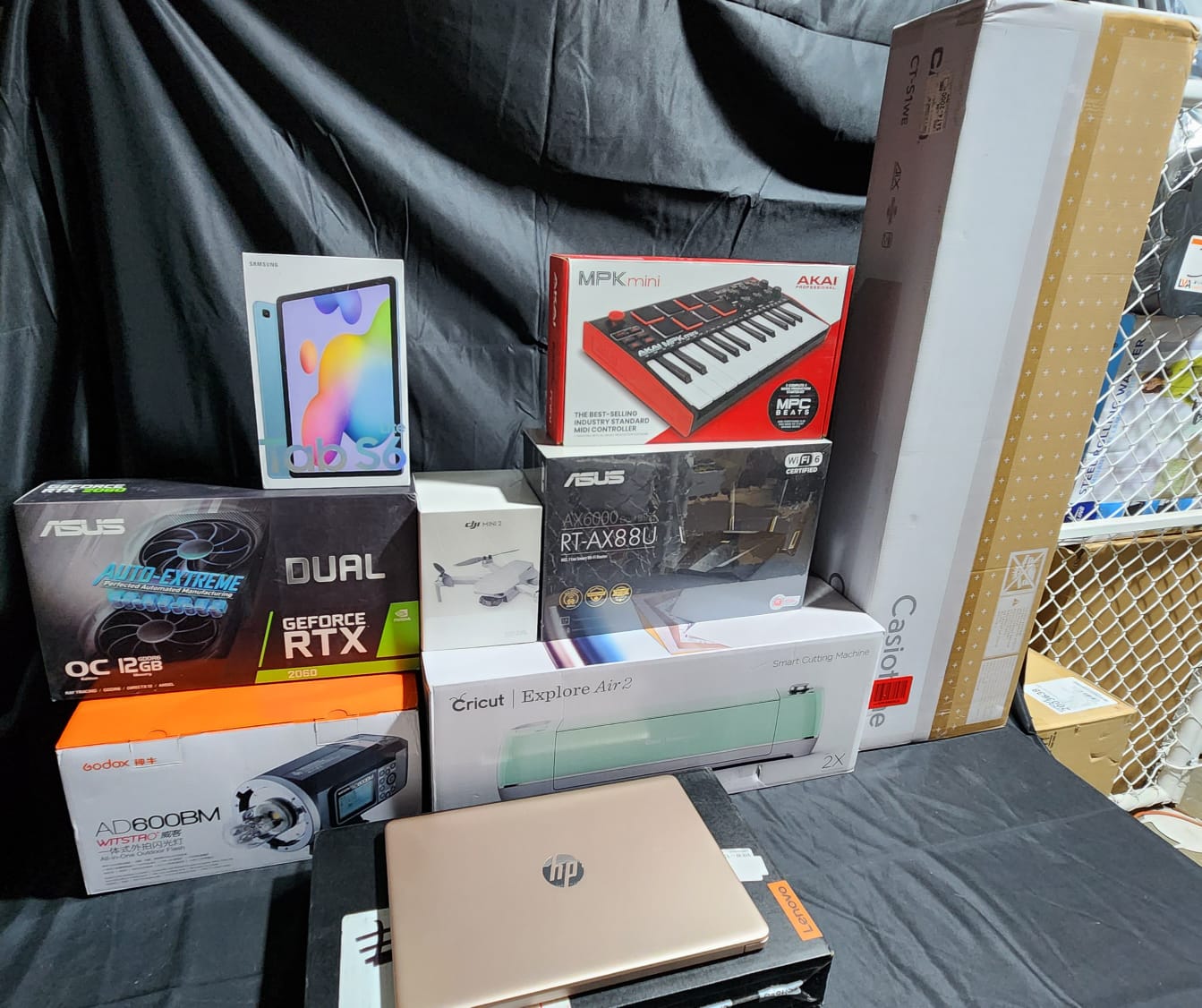 LOTE COMPUESTO POR: (1) LAPTOP 2021 LATEST LENOVO YOGA 7I, (1) LAPTOP HP FULL HD IPS, (1) FLASH PARA FOTOGRAFIA GODOX AD600BM BOWENS MOUNT 600WS GN87, (1) DRON DJI MINI 2, (1) TARJETA DE VIDEO ASUS DUAL GEFORCE RTX 2060 EVO, (1) ROUTER GAMING ASUS AX6000 WiFi 6, (1) TABLET SAMSUNG GALAXY TAB S5 LITE, (1) TECLADO CASIO 61-KEY, (1) MINI PLOTTER DE CORTE CRICUT EXPLORE AIR 2, (1) CONTROLADOR MIDI AKAI PROFESSIONAL MPK MINI MK3, MERCANCIA NUEVA.
