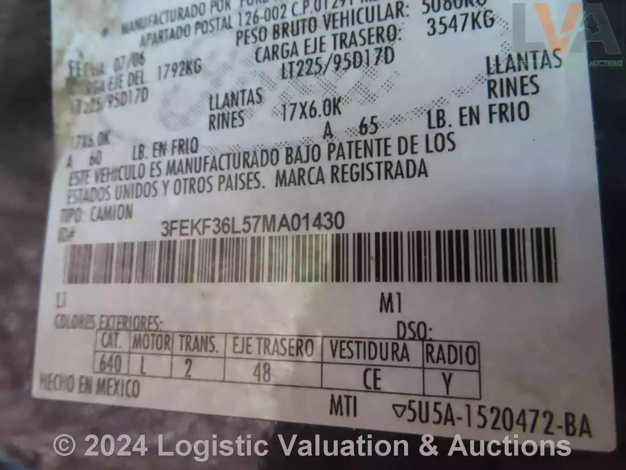 CAMIONETA REDILAS, MARCA: FORD, MODELO: F350, AÑO: 2007, SERIE: 3FEKF36L57MA01430, DESCRIPCION: CARROCERIA EN REGULAR ESTADO, INTERIORES EN MAL ESTADO, MOTOR COMPLETO, CARDAN DESMONTADO SIN BATERIA FISICA, SIN LLAVES, LLANTAS EN MAL ESTADO, NO OPERA