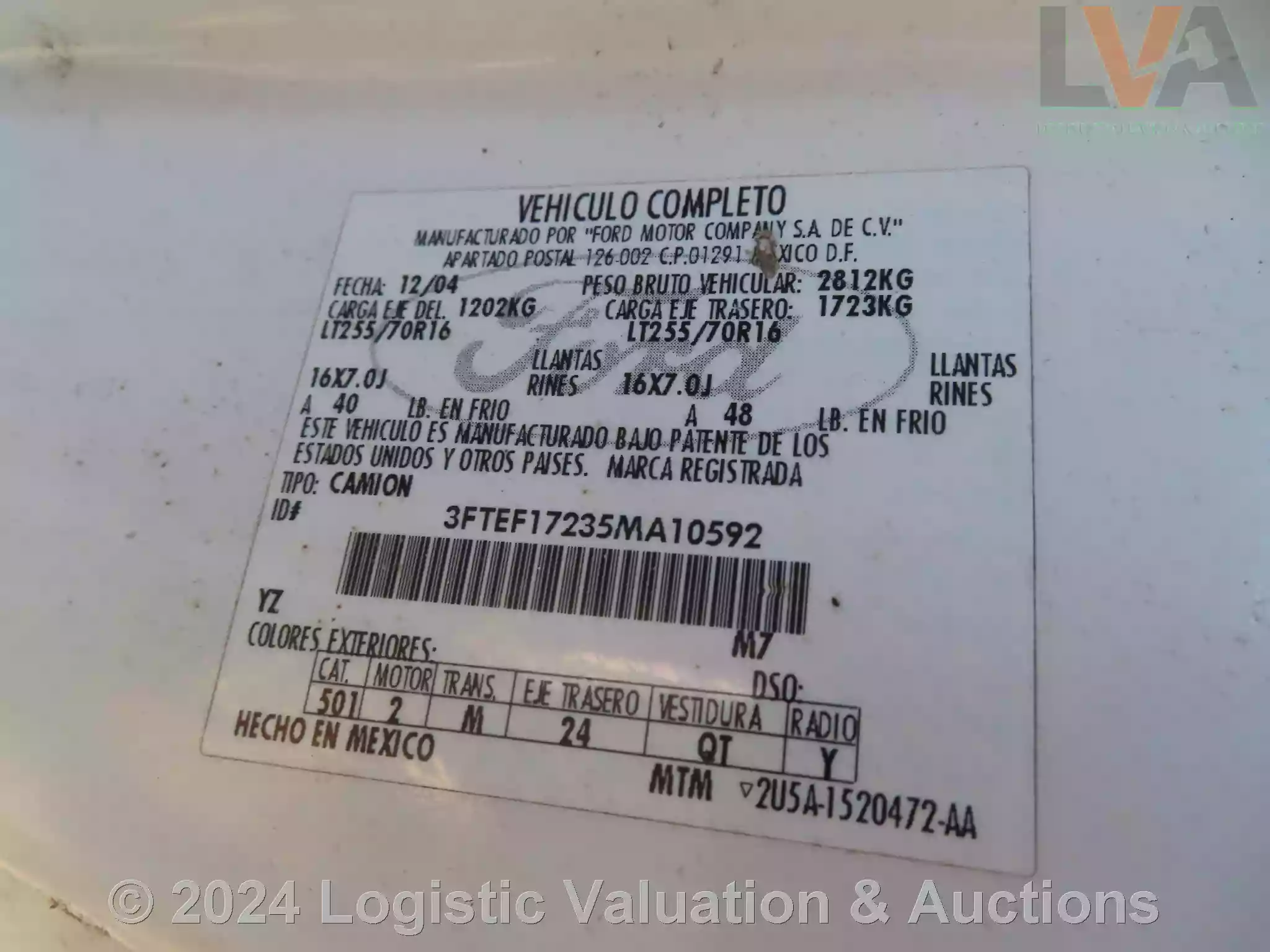 CAMIONETA, MARCA: FORD, MODELO: F150, AÑO: 2005, SERIE: 3FTEF17235MA10592, DESCRIPCION: CARROCERIA EN REGULAR ESTADO, INTERIORES EN REGULAR ESTADO, MOTOR COMPLETO, SIN BATERIA FISICA, SIN LLAVES, LLANTAS EN MAL ESTADO, NO OPERA