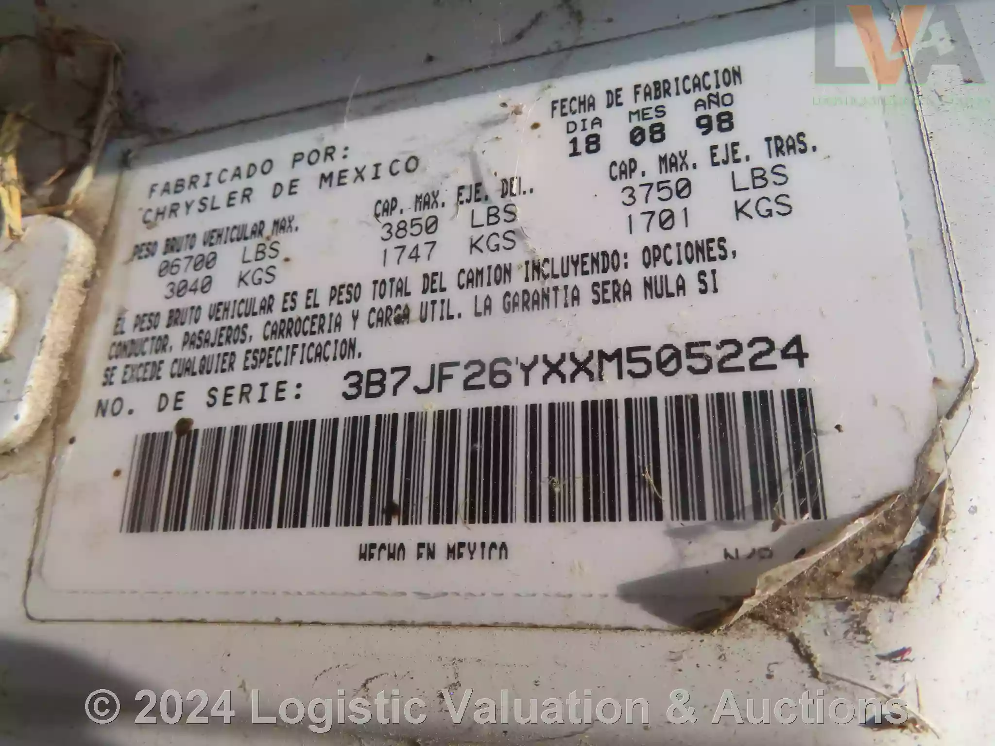 CAMIONETA, MARCA: DODGE, MODELO: RAM 2500, AÑO: 1999, SERIE:  3B7JF26YXXM505224, DESCRIPCION: CARROCERIA EN REGULAR ESTADO, INTERIORES EN MAL ESTADO, MOTOR CON PIEZAS FALTANTES, SIN BATERIA FISICA, SIN LLAVES, LLANTAS EN MAL ESTADO, NO OPERA