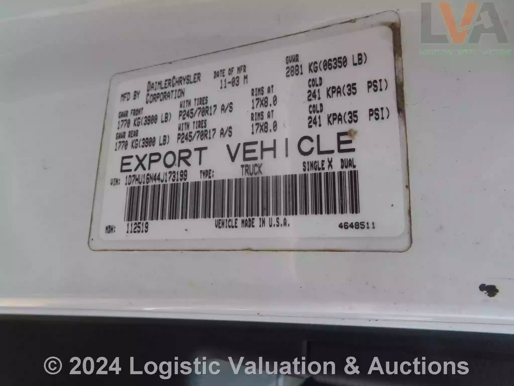 CAMIONETA, MARCA: DODGE, MODELO: RAM 2500, AÑO: 2004, SERIE: 1D7HU16N44J173199, DESCRIPCION: CARROCERIA EN REGULAR ESTADO, INTERIORES EN REGULAR ESTADO, MOTOR COMPLETO, SIN BATERIA FISICA, SIN LLAVES, LLANTAS EN MAL ESTADO, NO OPERA
