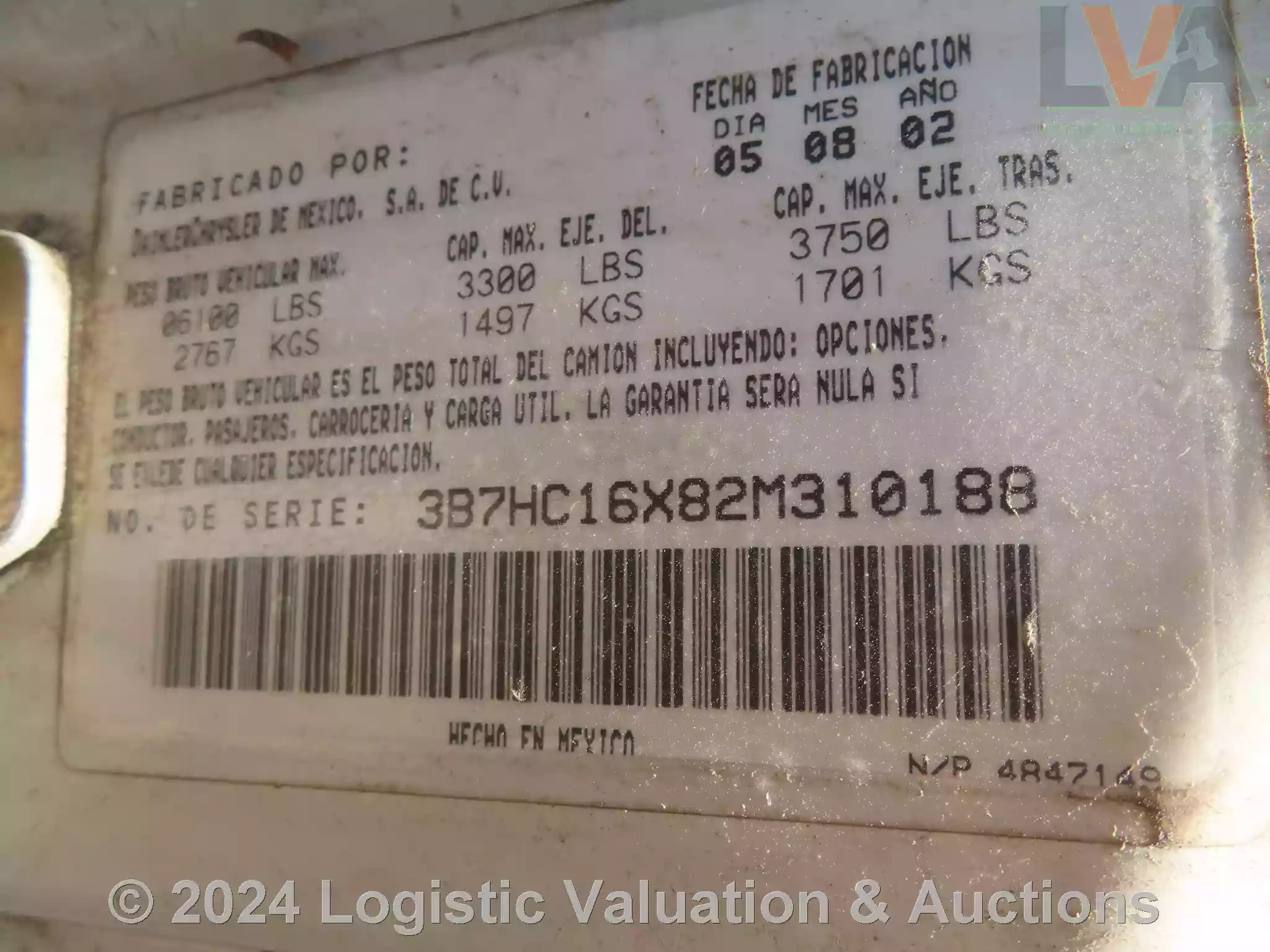 CAMIONETA, MARCA: DODGE, MODELO: PICKUP, AÑO: 2002, SERIE: 3B7HC16X82M310188, DESCRIPCION: CARROCERIA EN MAL ESTADO, INTERIORES EN MAL ESTADO, MOTOR CON PIEZAS FALTANTES, SIN BATERIA, SIN LLAVES, LLANTAS EN MAL ESTADO, NO OPERA