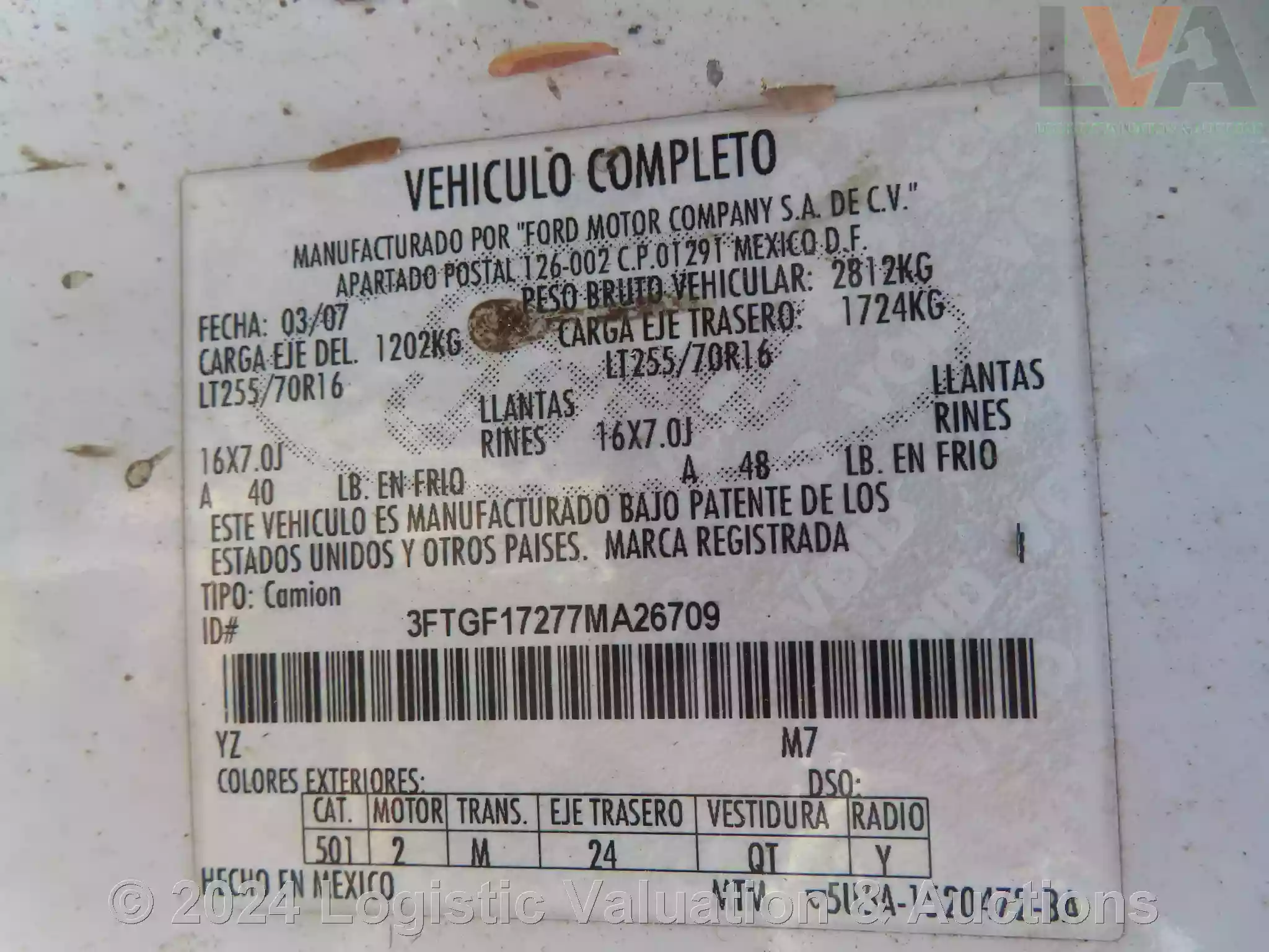 CAMIONETA, MARCA: FORD, MODELO: F150, AÑO: 2007, SERIE: 3FTGF17277MA26709, DESCRIPCION: CARROCERIA EN REGULAR ESTADO, INTERIORES EN REGULAR ESTADO, MOTOR COMPLETO SIN BATERIA FISICA, LLANTAS EN MAL ESTADO, SIN LLAVES , NO OPERA