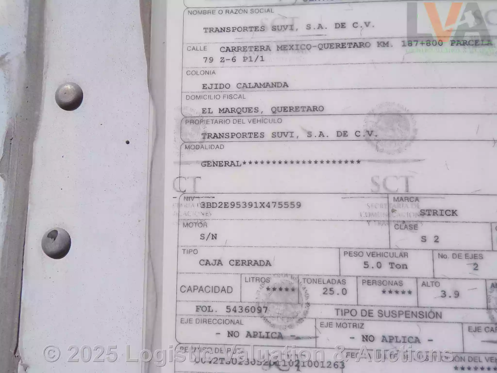 CAJA SECA, MARCA: STRICK, MODELO: 53´, AÑO: 2001, SERIE: 3BD2E95391X475559, CONDICIONES: PUERTA: ABATIBLE, SUSPENSIÓN: NEUMATICA, ECO: 1004