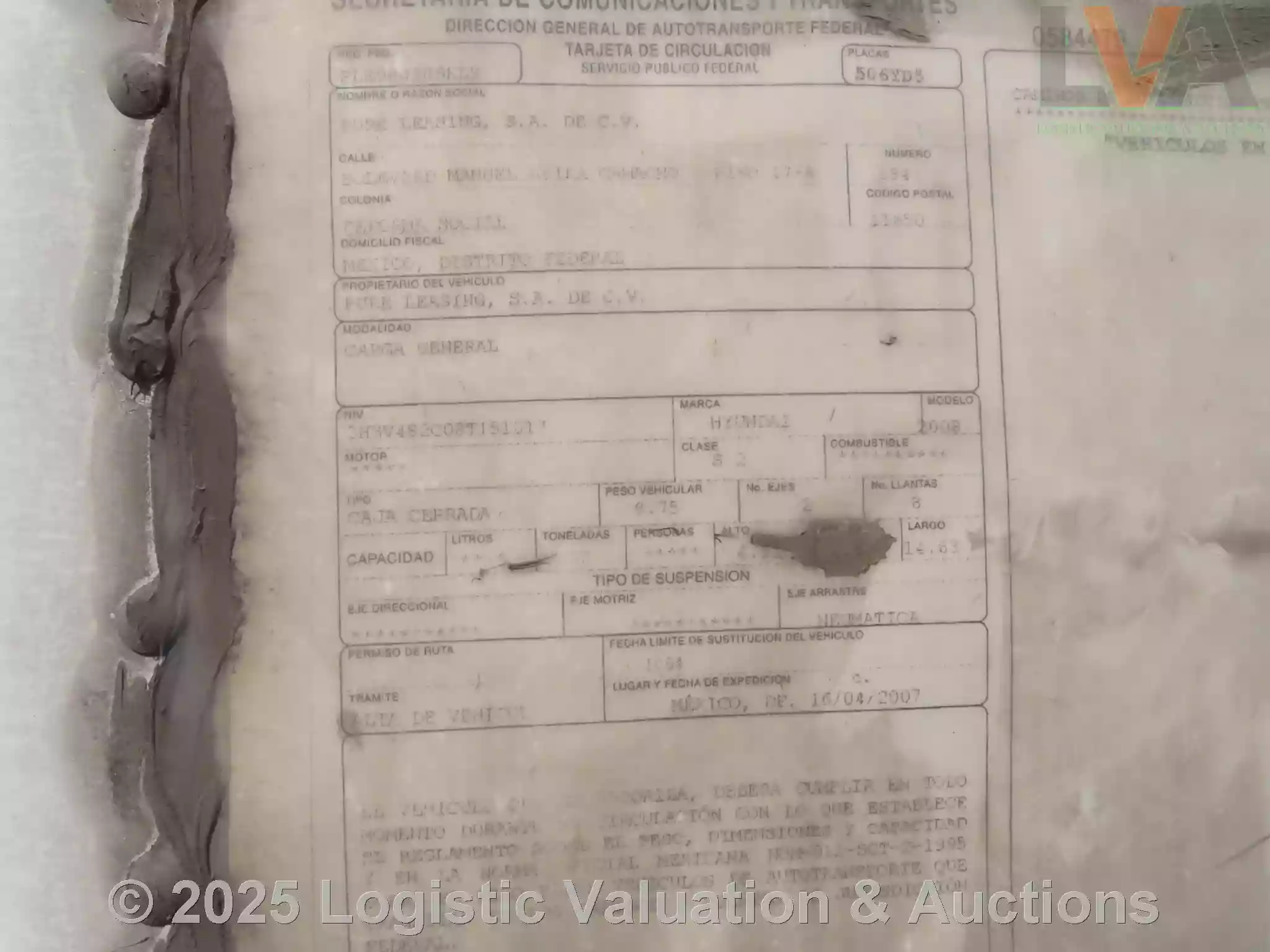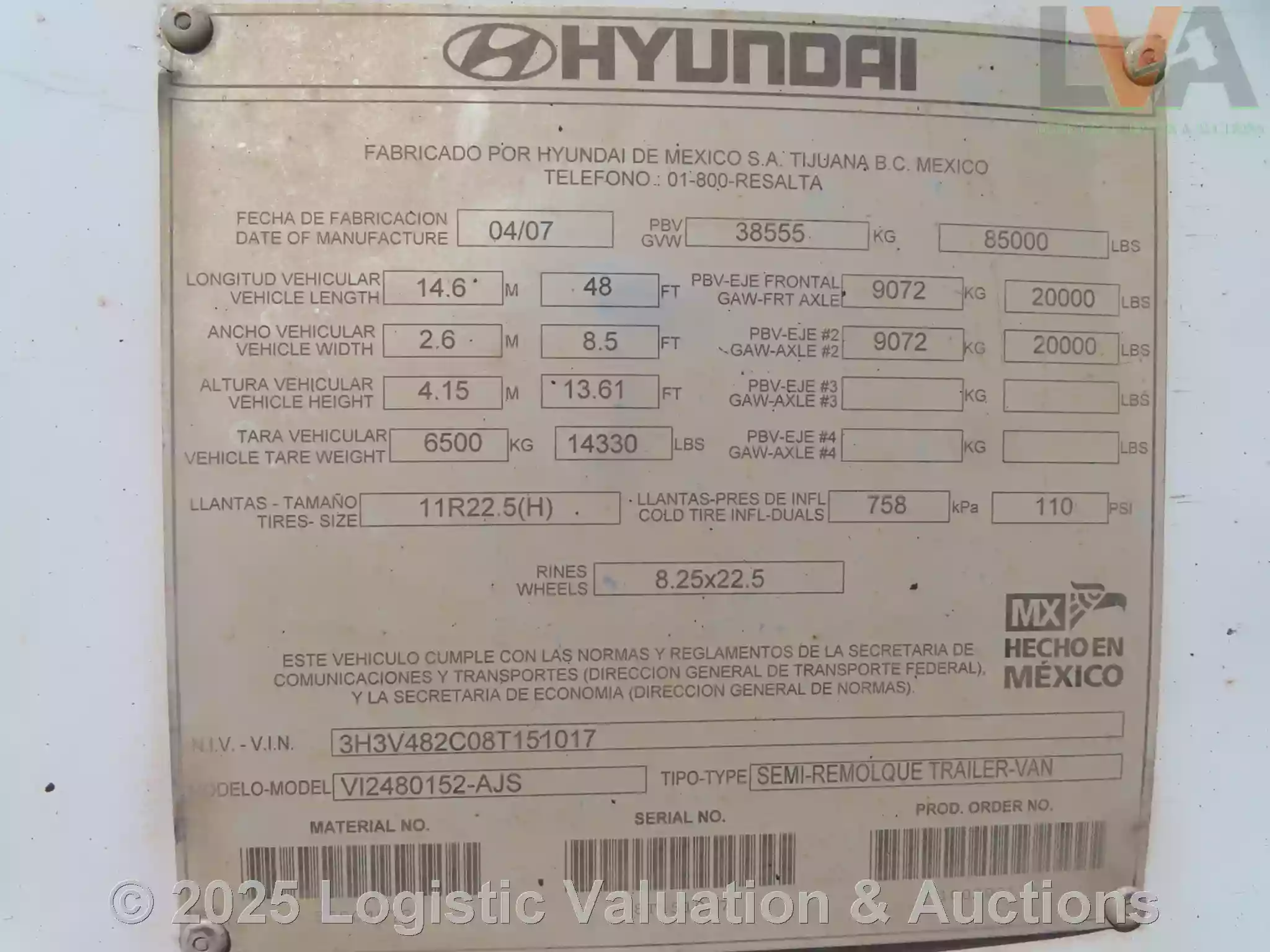 CAJA SECA, MARCA: HYUNDAI, MODELO: 48´, AÑO: 2008, SERIE: 3H3V482C08T151017, CONDICIONES: PUERTA: ABATIBLE, SUSPENSIÓN: NEUMATICA, ECO: 9307